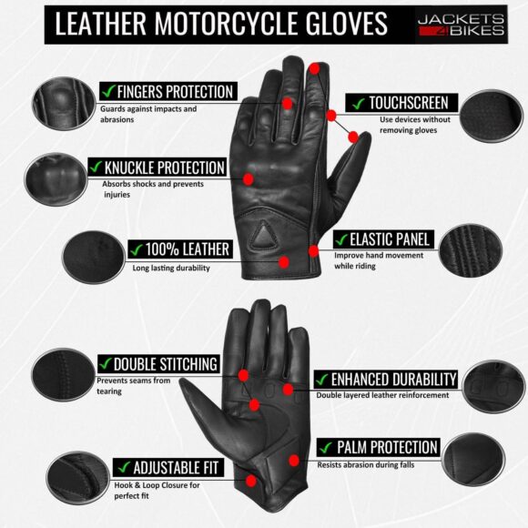 - TOP-QUALITY ANILINE GOAT LEATHER: Jackets4bikes premium motorcycle gloves are crafted from genuine aniline goat leather, known for its exceptional durability, flexibility, and comfortable feel. This high-grade leather resists everyday wear and tear, offering long-lasting performance and comfort. Designed to withstand the rigors of the road, our motorcycle gloves deliver a perfect blend of strength and style for serious riders.