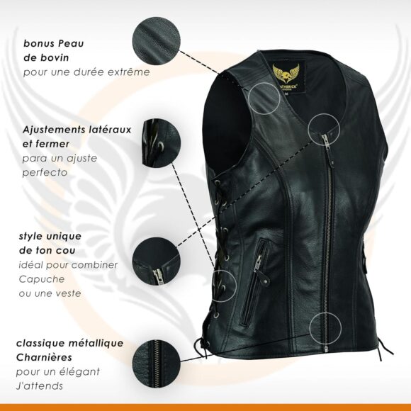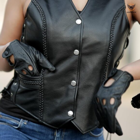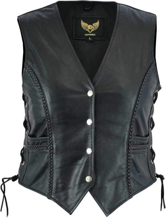 Leatherick Women Top Grain Genuine Buffalo Black Ladies Leather Vests for Motorcycle Bikers