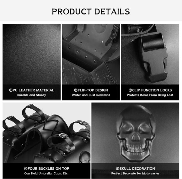 - [REINFORCED STRUCTURE] The inner base of motorcycle hard saddlebags is made of thick PE material and can be freely disassembled to keep the saddle bag in good shape. Made of PU leather material, the flip-top design is very waterproof and dustproof, and the sides of the hijab are thickened to make it stronger and more durable. There are four buttons on the top and a retractable strap to store frequently used items such as raincoats and water bottles to save space.