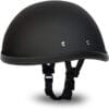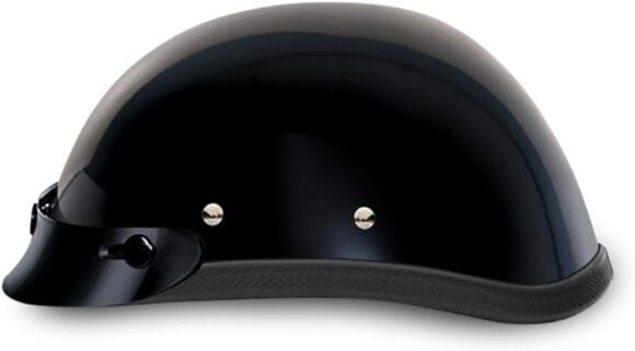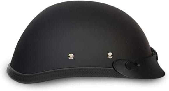Already having multiple styles of full and 3/4 face helmets, I wanted something to compliment riding the Harley V-Rod Muscle during this hot, summer season. After visiting multiple cycle shops, I tried on many helmets of this style all being DOT rated but I just was not feeling the “flare or mushroom head look” for my medium build and large helmet size.While browsing Amazon, I found one person who posted pictures wearing the Daytona and since I like to make purchases based on the experience of others this helped convinced me to get one.Now my honest review. This helmet is very comfortable on top of my clean, shaved head and fits true to size. The quick connect/release is easy to operate even while wearing gloves and the strap holds it in place with no wind buffeting! I’ve pushed passed 100 MPH and no lifting.The only complaint is some pinching on top of my left ear from the buckle, so maybe a small piece of padding would help.This lid is NOT DOT approved but I suggest not using those deceptive stickers which could get you into extra trouble depending on were you live.Overall, the lid looks great and compliments my bike. It gets plenty of likes and attention but none from the County Bounty! I plan to get another in black-gloss.